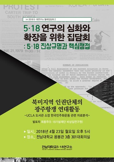 [대학저널 임승미 기자] 전남대학교(총장 정병석) 5·18연구소가 오는 23일 전남대 용봉관 3층 대회의실에서 열리는 4월 집담회에서 2017년에 입수한 미국 UCLA 동아시아도서관이 소장한 한국민주화운동 관련 자료에 대한 그동안의 분석결과를 발표한다.
