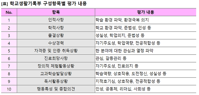 학교마다 중요시하는 평가요소는 다르겠지만, 대부분의 대학은 학생부종합전형에서 지원자의 ‘학업능력, 전공적합성, 자기주도성, 발전가능성, 인성’ 다섯 가지를 중심으로 학생을 선발하고자 한다. 다섯 가지 평가 기준을 통해 학생이 입학 후 대학 생활을 얼마나 잘 해낼 수 있는지를 알아보려 하는 것이다. 결국 2019학년도 대입을 준비하는 재학생들은 대학이 ‘나’에게 요구하는 이 다섯 가지에 대한 답변을 준비하기 위해 ‘교과’와 ‘비교과’에 중점을 두고 학교생활을 해야 한다.