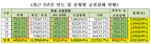 국회 행정안전위원회 소속 홍철호 의원이 교육부로부터 제출받은 자료에 따르면 교권침해 건수는2013년 5562건, 2014년 4009건, 2015년 3458건, 2016년 2616건, 2017년 2566건 등 최근 5년간 총 1만 8211건에 달했다.