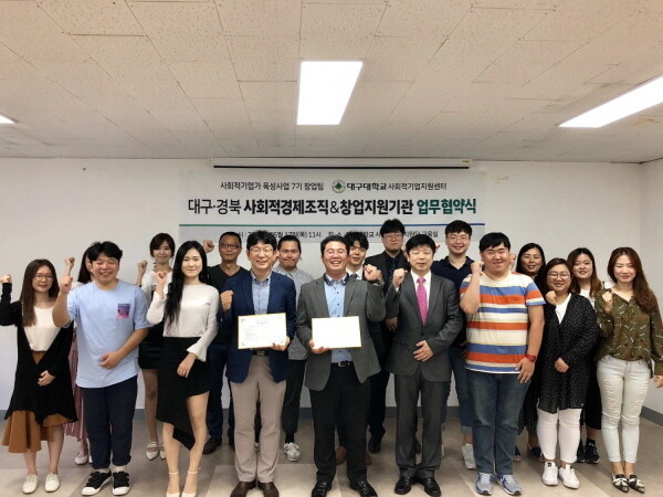 [대학저널 임지연 기자] 대구대학교 사회적기업지원센터(소장 김영한)가 지난 17일 대구대 경산캠퍼스 생명환경대학에서 대구·경북 소재 사회적 기업, 마을기업, 협동조합 및 사회적 기업가 육성사업 7기 창업팀 등(이하 사회적경제조직)과 사회적 경제 활성화를 위한 업무협약을 체결했다. 협약식에는 김영한 사회적기업지원센터 소장을 비롯한 사회적경제조직 관계자 20명이 참석했다.