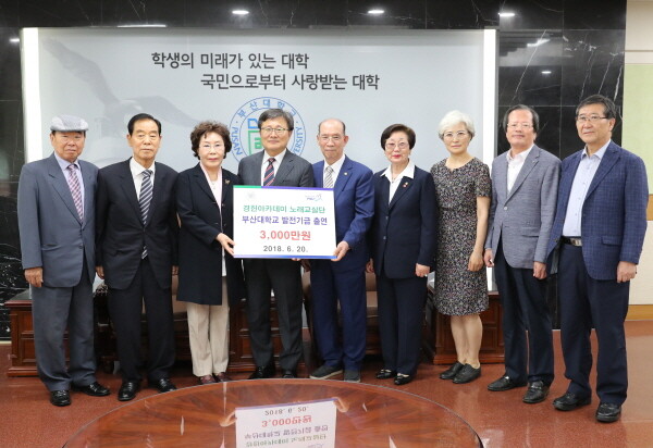 [대학저널 임지연 기자] 부산대학교(총장 전호환) 평생교육원 경헌실버아카데미 수료생 모임인 ‘경헌노래교실단’에서 부산대에 장학금 3000만 원을 기탁했다.