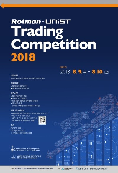 UNIST는 ‘로트만-UNIST 트레이딩 경진대회 2018’ 참가자 모집을 시작했다. 대회 접수는 7월 15일까지 홈페이지(http://trading.unist.ac.kr)를 통해 진행된다. 3명이 1개 팀을 이뤄 참가해야하며 참가비는 무료다. 대회 참가자 중 상위 3개 팀에는 소정의 상금이 제공된다.