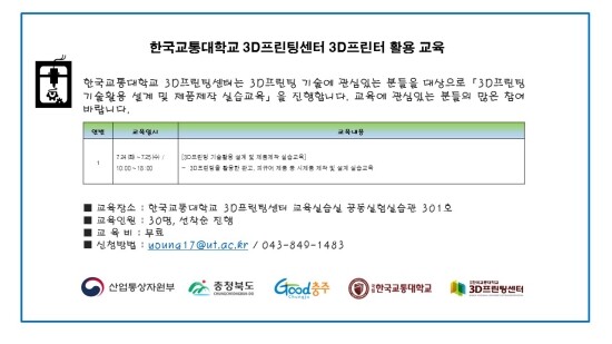 [대학저널 오혜민 기자] 한국교통대학교(총장 박준훈) 3D프린팅센터(센터장 박성준)가 오는 7월 24일부터 2일 간 3D프린팅 기술활용설계 및 제품제작실습교육을 산업체 재직자 및 일반인을 대상으로 진행한다.