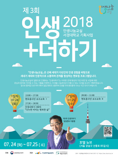 또한 서경대는 같은 날 오후 5시 30분부터 ‘2018 인생나눔교실’ 수도권지역 기획사업 ‘인생더하기’의 3회차 프로그램을 실시할 예정이다.
