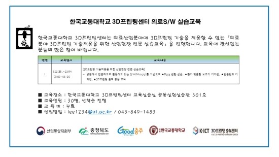 이번 교육을 운영하는 한국교통대(K-ICT 3D프린팅 충북센터)도 국내 많은 병원에서 3D프린팅 기술을 활용할 수 있도록 다양한 장비 및 기술, 교육 등을 지원하고 있다.