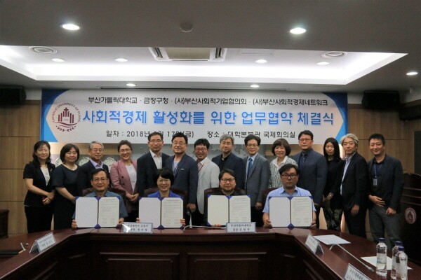 부산가톨릭대는 지난 17일 대학본부관 제1국제회의실에서 부산가톨릭대 김영규 총장, 정미영 금정구청장, 유제현 (사)부산사회적기업협의회 회장, 안하원 (사)부산사회적경제네트워크 이사장 등이 참석한 가운데 사회적경제 활성화를 위한 업무협약을 맺었다.