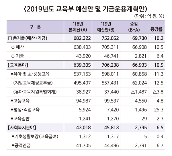 교육부는 “2019년 예산안은 △공교육 투자 확대를 통한 국민 부담 경감 △고른 교육기회 보장 및 안전하고 쾌적한 환경 조성 △대학의 혁신 역량 제고 및 자율성 강화 △선취업․후학습 및 평생직업교육 훈련 혁신에 중점을 두고 편성했다”고 밝혔다.