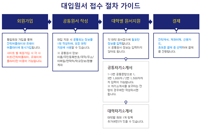 공통원서 접수시스템을 이용하려면 먼저 통합회원 가입이 필요하다. 원서접수 대행사(진학어플라이 혹은 유웨이어플라이) 중 한 곳에서 공통원서, 공통자기소개서를 작성할 수 있다. 공통원서 항목에 해당하는 '성명', '주민번호', '주소', '전화번호', '환불 계좌정보', '출신학교 정보'를 작성하면 된다. 공통자기소개서는 지원할 대학별 전형에서 요청하는 경우만 작성한다(모집요강 확인).