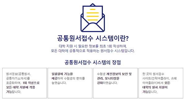 대교협 관계자는 “원서접수 마감 시점에 사용자 접속이 폭주하면 많은 시간이 소요되고, 다급하게 원서를 작성하다가 낭패를 볼 수 있다”며 “수험생들의 컴퓨터에서 공통원서 접수시스템 접속에 문제가 없는지 미리 확인한 후, 통합회원 가입과 공통원서 작성을 사전에 준비해야 한다”고 말했다.