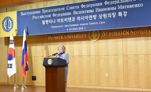 [대학저널 임지연 기자] 한국외국어대학교(총장 김인철)가 지난 4일 한국외대 서울캠퍼스 미네르바 콤플렉스 국제회의실에서 발렌티나 마트비엔코 러시아연방 상원의장을 초청해 재학생들과 교직원 대상으로 한반도 비핵화 과정 및 한·러 경제협력 관련 특강을 개최했다.
