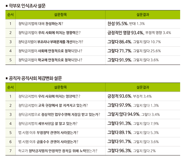 학부모 인식도 설문조사 결과 학부모들은 청탁금지법에 대해 95.5% 찬성했으며, 93.4%의 학부모가 긍정적으로 평가하는 것으로 나타났다. 또한 청탁금지법이 우리사회와 교육기관에 안정적으로 정착했는지 묻는 질문에는 교육기관(91.9%), 사회(71.7%) 순으로 응답해 청탁금지법이 교육현장에 빠르게 정착됐음을 알 수 있었다.