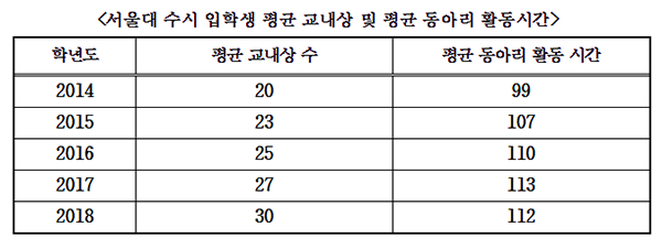국회 정무위원회 더불어민주당 김병욱 의원(경기도 성남시 분당을)이 서울대로부터 제출받은 2014~2018년 서울대 수시 합격생 교내상 현황에 따르면, 평균 교내상은 2014년 20개, 2015년 23개, 2016년 25개, 2017년 27개, 2018년 30개로 최근 5년간 평균 교내상 숫자가 증가한 것으로 나타났다.