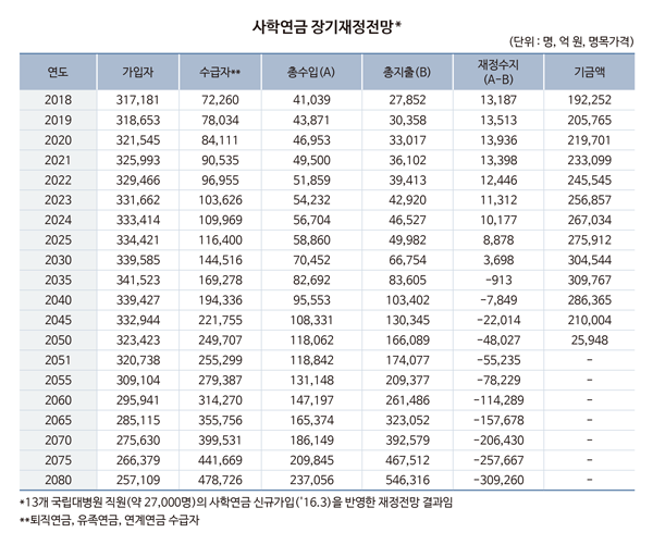 국회 교육위원회 이찬열 위원장(바른미래당)이 사립학교교직원연금공단으로부터 제출받은 자료에 따르면, 사학연금은 2035년부터 재정수지가 913억 원 적자로 돌아서고 2051년에는 기금액이 고갈될 것으로 추계됐다.
