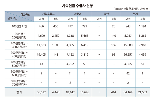 연금수급자 금액별 분포 현황을 분석한 결과 사립초중고 교원 3만 6017명 가운데 절반이 넘는 1만 9405명(53.9%)이 300~400만 원 미만의 연금을 받았고, 1만 1523명(32%)이 200~300만 원 미만의 연금을 받고 있다.