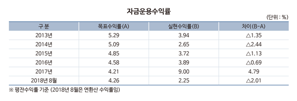 공단의 자금운용 수익률도 대부분 낮았다. 올해 목표 수익률은 4.26%였으나 실현 수익률은 2.25%에 불과했다. 2013년 이후 2017년을 제외하면 매년 목표수익률을 달성하는데 실패했다.