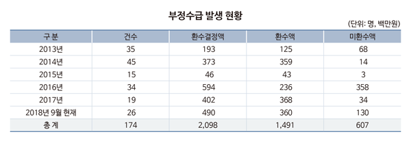2013년부터 2018년 9월까지 모두 174건의 부정수급이 발생했으며 환수결정액은 20억 9800만 원에 달했다. 이 가운데 14억 9100만원이 환수됐으나 환수결정액의 28.9%인 6억 700만 원은 현재까지 환수되지 않고 있다.