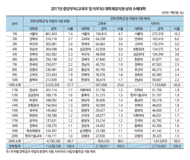 타부처 재정지원을 가장 많이 받은 대학은 2753억 원을 기록한 서울대로 타부처 재정지원 총액의 10.2%를 차지했다. 연세대, 고려대까지 합치면 비중은 21.2%까지 올라갔다. 상위 10개 대학은 42.6%, 상위 20개 대학까지 하면 59.5%에 달했다.