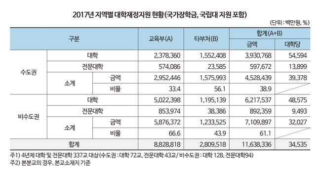 수도권·비수도권 비율은 비슷하나 대학당 지원액은 상이