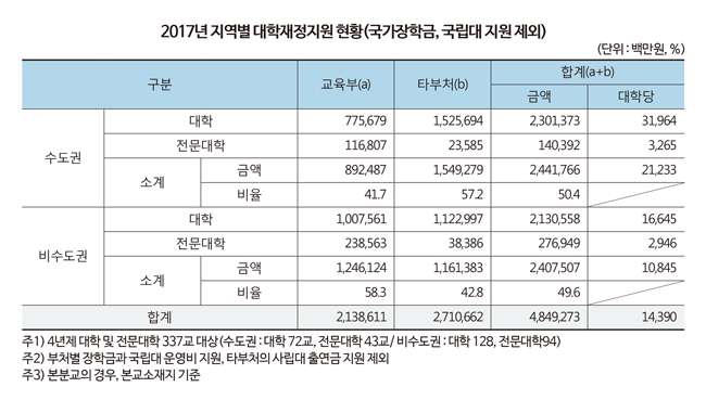 국가장학금과 국립대에 대한 운영경비 지원을 제외하면 재정지원의 수도권대학 쏠림현상은 더욱 뚜렷했다. 이를 제외한 재정지원 총액은 4조 8493억 원으로 수도권대학은 2조 4418억 원(50.4%), 비수도권은 2조 4075억 원(49.6%)로 거의 비슷했다. 그러나 대학당 지원액으로 보면, 수도권 대학당 지원금액은 212억 원인데 비해 비수도권 대학 지원액은 108억 원으로, 수도권 대학의 약 1/2 수준에 불과했다.