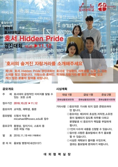 [대학저널 오혜민 기자] 호서대학교(총장 이철성)가 건학 40주년을 맞아 ‘제1회 호서 Hidden Pride’ 경진대회를 개최한다. 이번 경진대회는 호서대 구성원들이 갖고 있는 호서대의 숨은 자랑거리를 찾아 공유하기 위해 마련됐다.