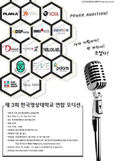 한국영상대학교 실용음악과가 총괄기획 및 주최를 맡은 ‘제3회 한국영상대학교 연합 오디션’은 오는 17일 한국영상대 예술극장에서 열린다.