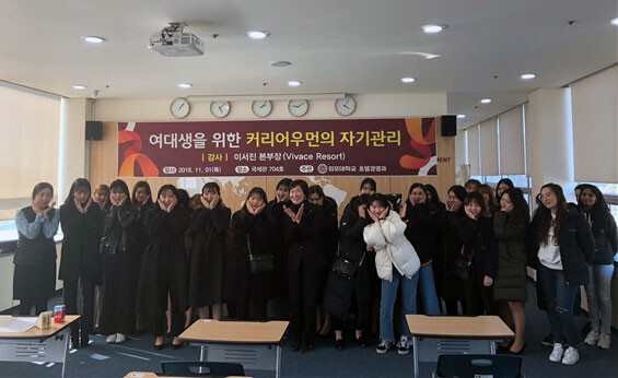 이번 특강은 호텔경영전공 분야에서 자기관리를 통해 여성CEO 역할을 수행하고 있는 선배가 자신의 경험을 전하는 시간으로 마련됐다.