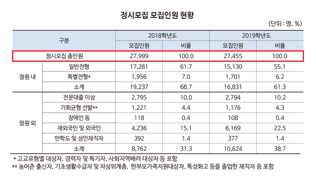전형별 모집인원을 살펴보면, ‘일반전형’의 경우 2018학년도 1만 7,281명 대비 2,151명(6.6%p)이 감소한 1만 5,130명을 모집할 계획이다. ‘특별전형(정원 내)’은 지난해 1,956명 대비 255명(0.8%p)이 감소한 1,701명을 모집한다. 반면 정원외 특별전형의 경우 작년보다 1,862명(7.4%P)이 증가한 1만 624명을 모집한다. 특히 ‘재외국민 및 외국인’특별전형 모집인원은 전년도 4,236명 보다 1,933명(7.4%p)이 증가한 6,169명(22.5%)을 모집할 계획이다.