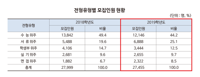 수능 위주 전형 비중은 전년도 대비 1,696명 줄어든 1만 2,146명이며 학생부 위주전형은 전년도 대비 662명 즐어든 3,444명을 모집한다. 반면 서류 위주 전형과 면접 위주 전형은 지난해보다 늘어난 게 특징이다.