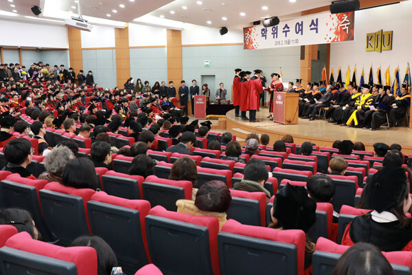 이날 학위수여식에는 정현태 총장을 비롯해 보직교수, 내빈, 학부모 등 500여 명이 참석했으며 학사 1117명, 석사 37명, 박사 7명 등 총 1161명이 학위를 받았다.