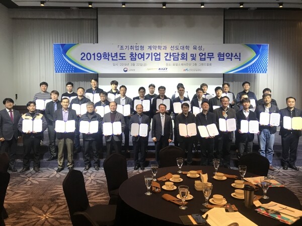 [대학저널 신효송 기자] 한국산업기술대학교(총장 안현호, 이하 산기대)는 지난 22일 안산 호텔스퀘어 2층 그랜드볼룸에서 조기취업형 계약학과 참여기업 간담회 및 업무 협약식을 개최했다.