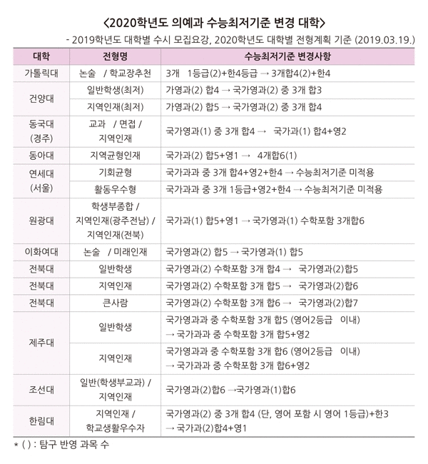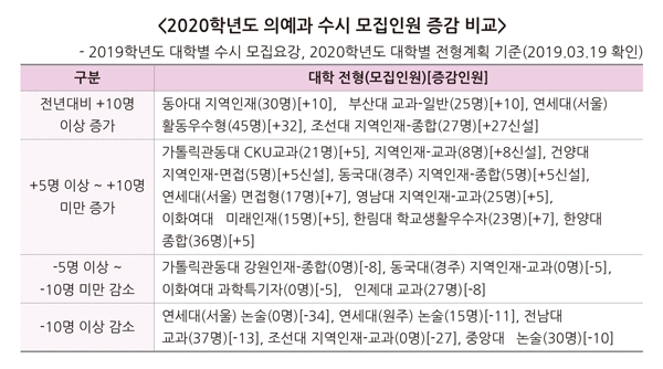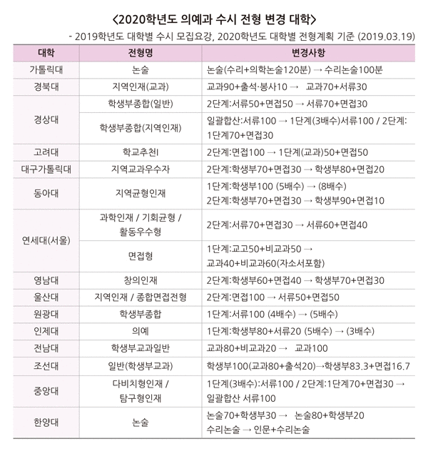 2020학년도 의예과 모집의 특징은 대학들의 전형별 모집인원 이동이 많다는 것이다. 연세대(서울) 의예과는 올해부터 논술전형으로 선발하지 않고, 학생부종합전형인 활동우수형 전형에서 전년대비 32명이 증가한 45명을 모집한다. 조선대는 학생부교과전형으로 모집했던 지역인재전형 27명을 올해 학생부종합전형으로 선발한다.