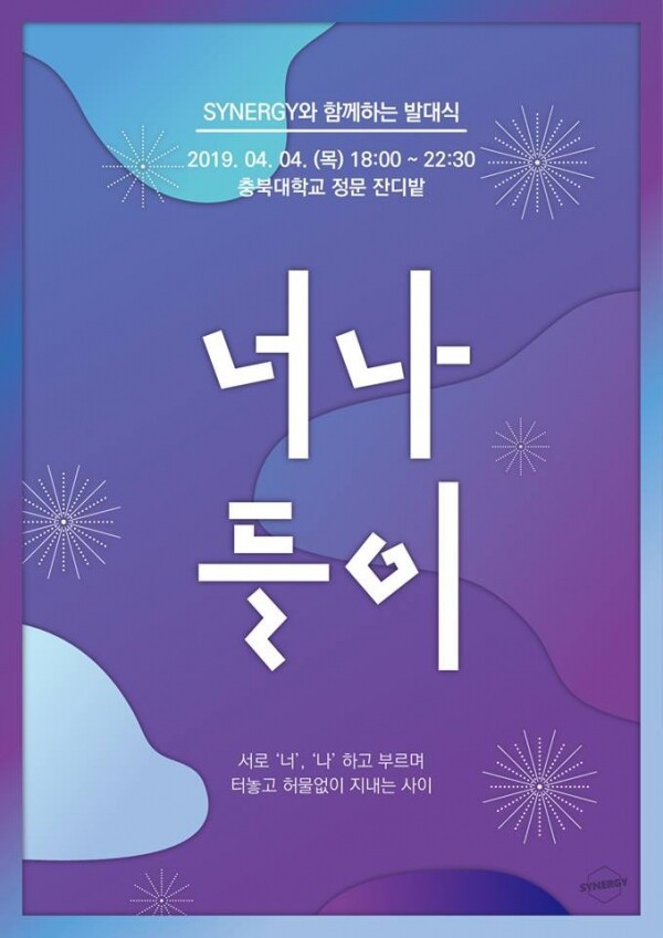 시너지 총학생회는 ‘맞잡은 두손, 더 나은 내일, 너와 나의 시너지’를 슬로건으로 오는 4일 오후 6시부터 정문 옆 잔디밭 특설무대에서 출범식 및 신입생가요제 진행에 앞서 청주지역 환경정화활동, 캠퍼스 환경정화활동, 헌혈증 기증식 등 지역사회를 위한 봉사활동을 진행할 예정이다.