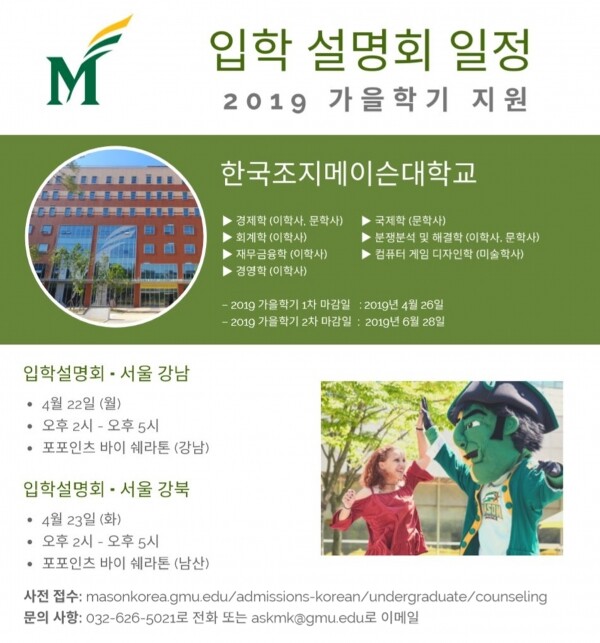 [대학저널 신효송 기자] 인천글로벌캠퍼스에 위치한 한국조지메이슨대학교(George Mason University Korea)가 '2019년도 가을학기 신입생 및 편입생 입학 설명회'를 오는 22일과 23일 서울에서 개최한다.