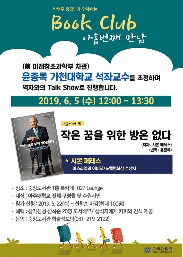 아주대는 6월 5일 정오 중앙도서관 1층 북카페에서 박형주 총장과 함께하는 9번째 북클럽을 연다.