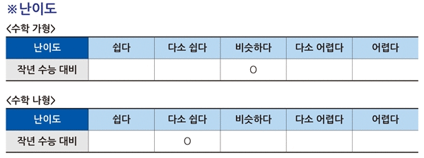 수학 ‘나’형은 전년도 수능보다 다소 쉬웠다는 의견이 많았다. 평이한 난이도의 문제들을 상당수 출제했고, 문제 유형 또한 한, 두 문항을 제외하고 기존과 크게 다르지 않았다. 고난도 문항 역시 이전과 비교했을 때, 상대적으로 쉽게 출제된 것으로 평가됐다. 다만 중위권 학생들은 다소 시간이 걸리는 문제가 있어 당황한 학생들이 있었을 것으로 추측된다.