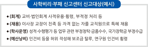 신고대상은 횡령·회계부정, 교직원 특혜채용, 보조금·국가장학금 부정수급, 입학·성적 관련 부정청탁 등 사립학교 및 학교법인과 관련된 부패·공익침해행위와 부정청탁행위다.