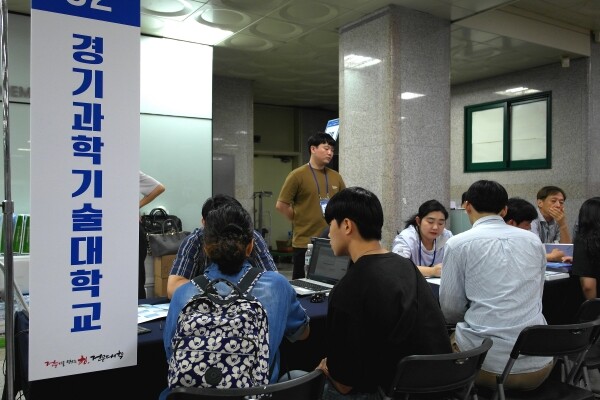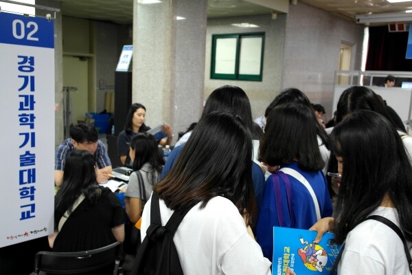 [대학저널 임지연 기자] 한국전문대학교육협의회가 주최하는 ‘2020학년도 수도권 전문대학 입학정보 박람회’가 19일 유한대 유일한기념관에서 열렸다. 오는 20일까지 계속된다. 이번 박람회에는 수도권 소재 43개 전문대학이 참여한다. 개막 첫날인 19일에는 수많은 수험생과 학부모들이 행사장에 몰려 현장 열기를 뜨겁게 달궜다. 사진은 경기과학기술대학교 부스 상담 모습.