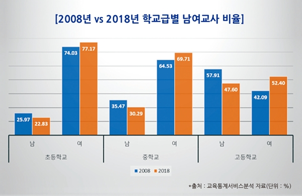 여교사 증가 폭으로 보면 고등학교, 중학교, 초등학교 순으로 커졌다. 고등학교는 2008년 42.09%에서 52.40%로 여교사의 비율이 10.31%p 증가했고, 중학교는 64.53%에서 69.71%로 5.18%p, 초등학교는 3.14%p 증가했다.