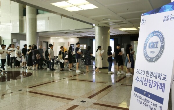 [대학저널 이승환 기자] 9일 서울 성동구 한양대학교 서울캠퍼스 HIT건물에서 열린 ‘2020학년도 한양대 수시상담카페’를 찾은 수험생과 학부모들이 상담 순서를 기다리며 줄지어 서 있다. 이틀간 진행될 수시상담카페에서는 총 1,500여명의 수험생‧학부모들을 대상으로 한 개별 입시상담이 진행될 예정이다.