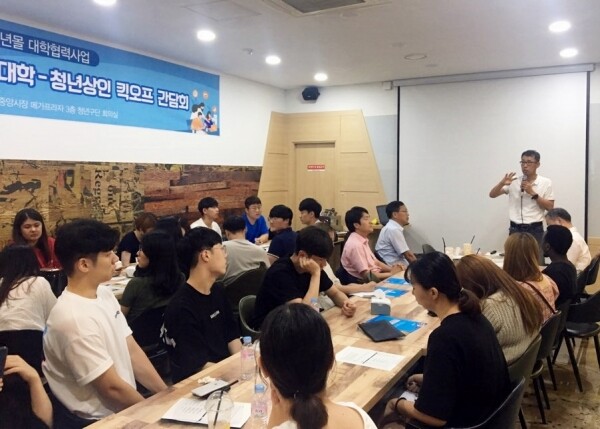 간담회는 청년몰 사업 활성화를 위해 참여학과별 사업추진내용과 향후 계획을 순서대로 발표하고 상인회의 의견을 청취하는 자리로 진행됐다.