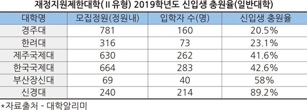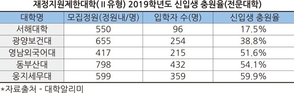 재정지원제한대학 한 관계자는 “올해는 200여명의 신입생이 입학했지만 학령인구가 큰 폭으로 줄어드는 2020학년도는 100명을 채우기 힘들 것”이라며 “재학생들을 비롯해 교직원들도 하나 둘 대학을 떠나고 있다”고 전했다.