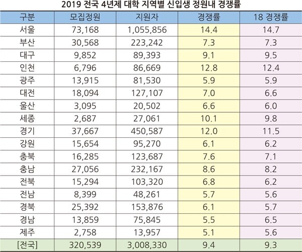 지역별로는 서울 소재 대학이 평균 14.4대 1(전년도 14.7대 1)로 가장 높았고, 인천 12.8대 1, 경기 11.5대 1 순이고, 수도권 대학으로는 평균 13.5대 1(전년도 13.5대 1)로 비수도권 대학 7.0대 1보다 크게 높았다.