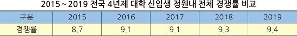 전국 4년제 대학 신입생 정원내 경쟁률은 2015학년도 8.7대 1에서 2019학년도 9.4대 1로, 5년 동안 상승추세를 보이고 있다.
