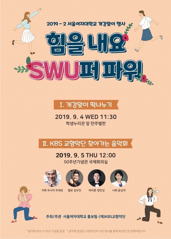 [대학저널 백두산 기자] 서울여자대학교(총장 전혜정)는 오는 9월 4일, 5일 이틀간 서울 노원구 서울여대 캠퍼스에서 개강맞이 행사 ‘힘을 내요, SWU퍼파워’를 개최한다.