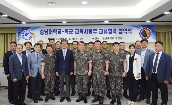 충남대 오덕성 총장과 육군 교육사령부 최영철 사령관 등 양 기관 관계자들은 3일 충남대 영탑홀에서 ‘충남대학교와 육군 교육사령부간의 교류협력 협약’을 체결했다.