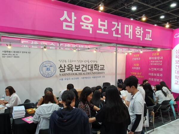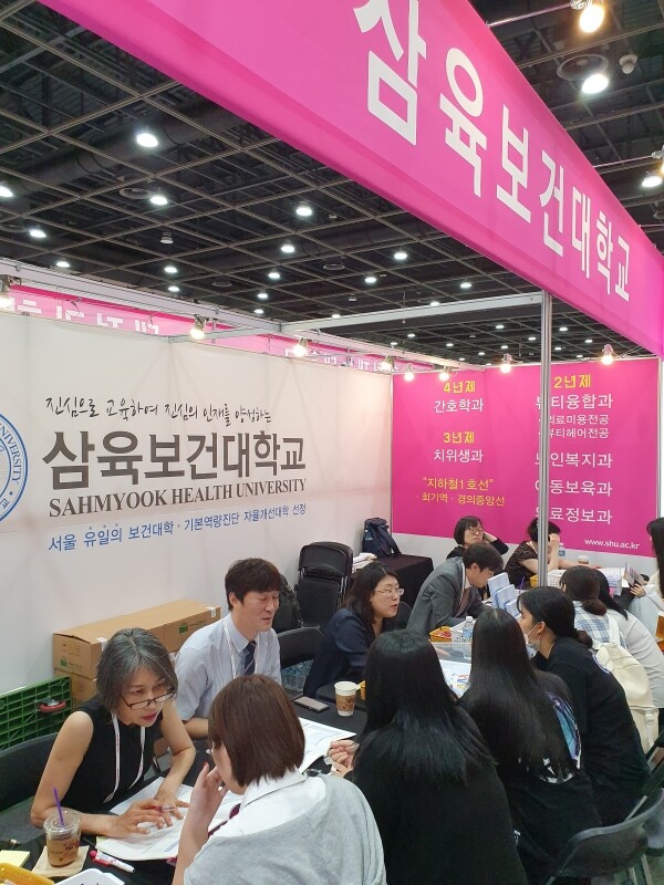 [대학저널 이승환 기자] 한국전문대학교육협의회가 주최하는 '2020학년도 수시 전문대학 입학정보 박람회'(이하 전문대 수시박람회)가 6일부터 8일까지 서울 서초구 양재 aT센터 제2전시관에서 열린다. 이번 전문대 수시박람회에는 전국 91개 전문대학이 참가한다. 현재 수험생과 학부모들이 발 디딜 틈 없이 몰리는 등 현장 열기가 뜨겁다. 사진은 삼육보건대 상담부스 모습.