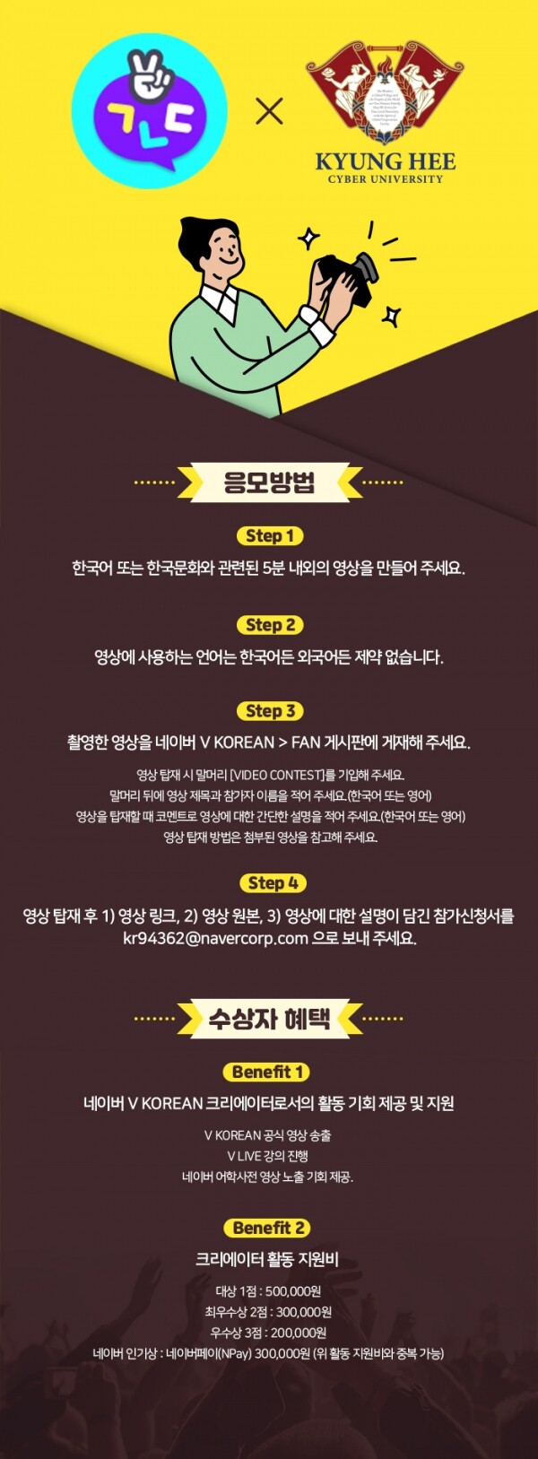제출된 영상은 교육적 유용성, 완성도, 학습흥미 유발, 대중성 등을 기준으로 평가를 진행할 예정이며, 수상자는 네이버 V KOREAN 크리에이터로서의 활동 기회 제공 및 지원과 크리에이터 활동 지원비의 혜택이 주어진다.