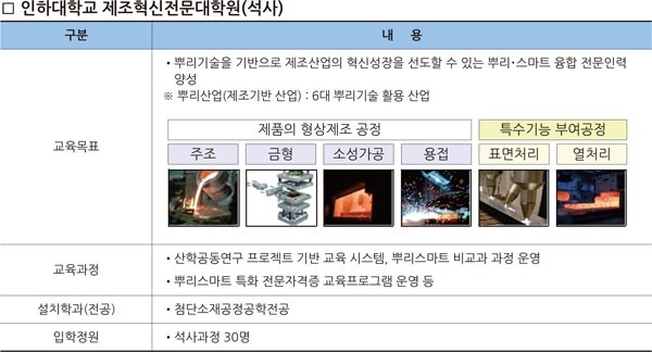 인하대 제조혁신전문대학원은 제조업의 혁신 성장을 선도하는 뿌리・스마트융합 분야 전문인력을 양성하기 위해 산업계와 학계가 공동연구를 통한 실무 중심의 석사 교육과정을 운영할 계획이다.