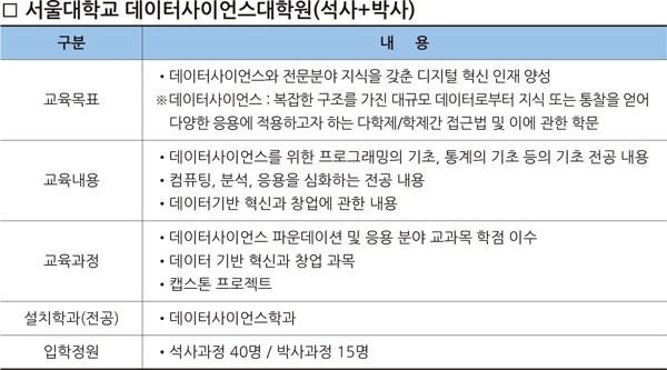서울대 데이터사이언스대학원은 여러 학문의 기초로 떠오르고 있는 데이터과학 분야의 석・박사 교육과정을 개설해 4차 산업혁명을 선도하는 융합형 인재를 양성하고자 한다.