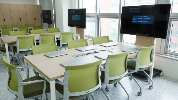 토론식 강의실에는 이동 가능한 그룹형 책상 및 의자를 배치하고 각 그룹별 화이트보드를 별도 설치함으로써 의사소통능력과 문제해결능력을 함양하는 토론식 수업 환경을 조성했다.